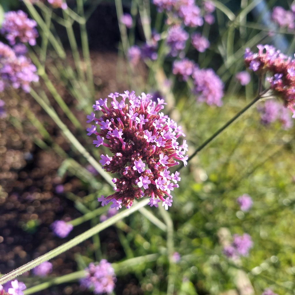 Ms. Faux and I have a garden. It is not very big, but it is packed with variety. One of our favorite perennials is this stick verbena. It spreads everywhere, it is impossible to kill, and the tiny clusters of purple flowers are beautiful. I’ve also included a song about a stick.