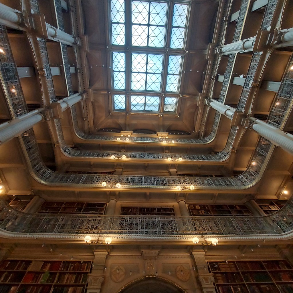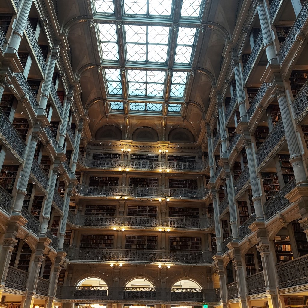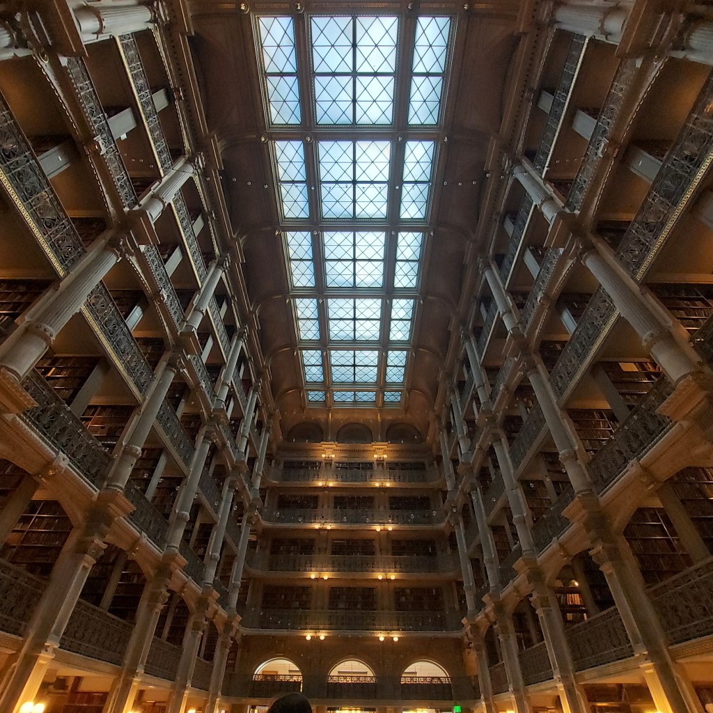 I had to take a week off from these posts due to personal stuff, but I’m back this week with some photos from a recent trip to Baltimore. This is the inside of the George Peabody Library. The interior of this library is one of the most beautiful libraries in the world. It was completed in 1878 and was designed by Baltimore architect Edmund G. Lind to be a cathedral of books. Per Wikipedia: