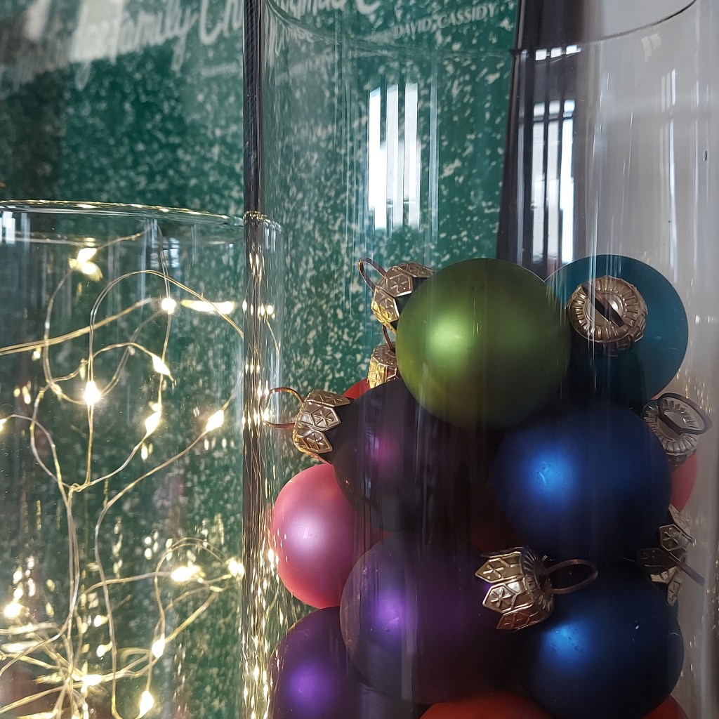 Today’s Holiday photo showcases several of Ms. Faux’s favorite Holiday decoration methods. There is a framed Holiday LP in the background, along with a small vase of battery-powered string lights and a larger vase with glass ornaments. I have also included my favorite blues Holiday tune.